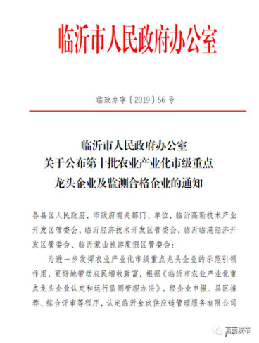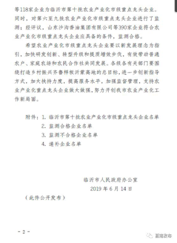 喜報|莒南瀚德食品有限公司被評為 臨沂市農業產業化重點龍頭企業!近日,臨沂市人民政府辦公室公布第十批農業產業化市級重點龍頭企業名單,莒南瀚德食品有限公司成功入選。 莒南縣上榜企業名單 臨沂市公布第十批農業產業化市級重點龍頭企業 (10家): 山東興祥食品有限公司 莒南瀚德食品有限公司 山東瑞祥泰勞保用品有限公司 臨沂恒興泰勞保用品有限公司 莒南縣旺盛食品廠 莒南金慧通飼料有限公司 山東綠城家居有限公司 山東正山堂茶業有限公司 莒南富源春茶業有限公司 莒南縣金秋糧油食品有限公司 監測合格企業名單(41家) 臨沂溢嘉食品有限公司 莒南六和養殖有限公司(原莒南六合養殖有限公司) 山東東海食品有限公司 山東潤正豐食品有限公司 莒南縣東藝工藝品有限公司 莒南縣東盛果菜專業合作社 山東夢園農業科技股份有限公司 臨沂濟生春茶業有限公司 莒南縣松山春茶葉專業合作社 莒南縣老子峪茶業有限公司 山東金紅利飼料有限公司 臨沂帛乘原種豬繁育有限公司 臨沂恒豐飼料科技有限公司 山東大農藥業有限公司 山東三農生物科技有限公司 山東三方化工集團有限公司 山東福美農業科技有限公司 (原山東福美農業科技股份有限公司) 莒南縣三圓花生加工廠 莒南縣正大花生加工廠 山東君成皮業有限公司(原臨沂君成皮革有限公司) 臨沂海達爾飼料有限公司 臨沂新糧飼料科技有限公司 臨沂真源觀光農業科技有限公司 山東華英澤眾禽業有限公司(原山東澤眾食品有限公司) 山東海牧生物科技有限公司 山東中牧獸藥有限公司 臨沂長榮木業有限公司 莒南縣福群食品有限公司 山東九牛飼料有限責任公司(原臨沂九牛飼料有限公司) 臨沂金龍湖茶業有限公司 莒南玉佳花生食品有限公司 莒南縣順達食品有限公司 臨沂環宇食品有限公司(原莒南縣環宇食品有限公司) 臨沂市同盛德飼料有限公司 布恩農牧科技有限公司(原山東布恩農牧科技集團有限公司) 莒南縣嘉瑞食品有限公司 莒南縣開冰糧油食品有限公司 莒南縣源泰家居用品有限公司 山東派皇皮革制品有限公司 臨沂和豐牧業有限公司 山東金豐糧油食品有限公司 監測不合格企業(9家) 臨沂興昌農業科技有限公司 莒南縣淇岔河花生食品有限公司 山東萊貝特飼料有限公司 莒南縣寶利糧油食品有限公司 莒南縣新綠食品有限公司 山東富邦肥業有限公司 山東康平生物科技有限公司 莒南縣華元牧業有限公司 山東國盛食品有限公司 遞補企業名單(11家) 山東裕嘉農業科技有限公司 莒南縣福潤食品有限公司 莒南縣糧田果蔬種植專業合作社 山東洪祥包裝有限公司 山東小晶編織工藝品有限公司 山東金農華藥業有限公司 莒南縣綠逸茶葉專業合作社 莒南縣貴花種植專業合作社 莒南縣新農村茶葉專業合作社 山東御爾康商貿有限公司 莒南匯豐食品有限公司 |